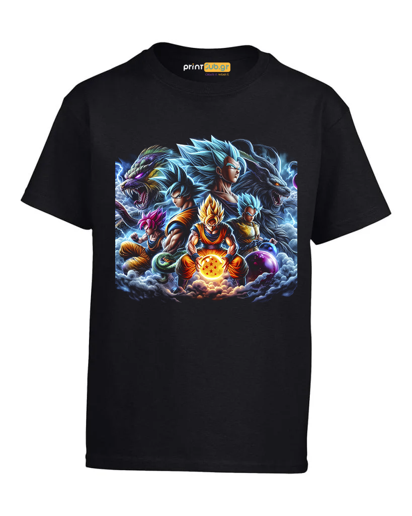 Αυτή η εικόνα απεικονίζει τον Son Goku, τον πρωταγωνιστή της διάσημης σειράς anime και manga Dragon Ball.  Ο Goku είναι ένας Saiyan, μια εξωγήινη φυλή πολεμιστών με υπεράνθρωπη δύναμη.  Η εικόνα παρουσιάζει διάφορες μεταμορφώσεις του, συμπεριλαμβανομένων των μορφών Super Saiyan και Super Saiyan God/Blue.  Κρατάει μια από τις Dragon Balls, επτά μαγικές σφαίρες που, όταν συγκεντρωθούν, καλούν έναν δράκο που πραγματοποιεί ευχές.  Η σειρά ακολουθεί τις περιπέτειές του καθώς εκπαιδεύεται στις πολεμικές τέχνες και προστατεύει τη Γη από διάφορους εχθρούς.